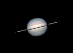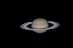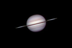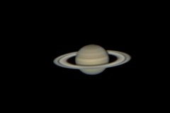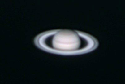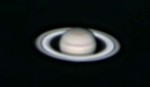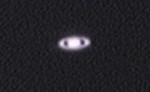| This is my first ever attempt at astrophtography, 11/5/04. I used my old 60mm refractor, unguided, with a Quickcam 4000 webcam. It's not much to look at, but it lit the fire. | This is my first decent pic of Saturn - taken with my EXT-105 (all the rest are with it) and the Quickcam 4000 on 11/25/04. Magnification is about 150x. (not clickable) | This pic was taken on 2/1/05 with my Meade Deep Sky Imager camera. All later pics are taken with this camera. A Barlow lens is used for a magnification of about 400x. | Same as the previous pic, but with different processing options. |