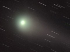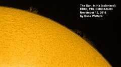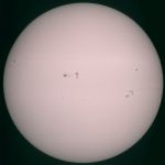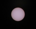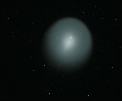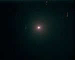 | The sun, 7/1/05. This photo waas taken with a 10x zoom digital camera and a solar filter. The filter looks like tinfoil and blocks so much light it looks opaque unless you hold it up to the sun or look at the filament of a light bulb with it (you can't even see a frosted bulb through it). | This is a composite taken through the telescope, using the filter, on 7/4/05. Sunspots are clearly visible. | Comet Macholz, taken on 1/1/05. Unfortunatly, there was very little outgassing, so there was no tail. What is interesting is that the comet moves so fast that the stars in the background show trails after only about 5 minutes. | |