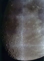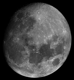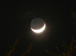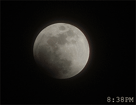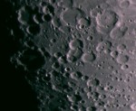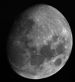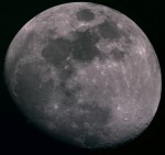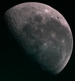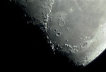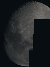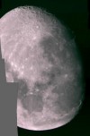 | You may notice, there is more detail in the partial phases than when it is near full: Shadows add depth, making it look more 3d. | On April 1, the Moon occulted (passed in front of) the Pleaides star cluster. You can see the dark part of the moon because of "Earthshine" - sunlight reflected from the Earth, illuminating the moon. This is a 1 sec exposure with a 10x zoom digital camera. | This is an animation zooming in on the moon, showing the various magnifications I get with my telescope. For a larger version (warning - big) click HERE | |