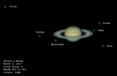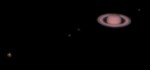 | This is Saturns and it's moons Titan, Rhea, Tethys, Mimas, and Dione, taken 1/1/05. To get the moons, I had to overexpose Saturn. | This is a composite of Saturn and the moons Titan, Rhea, Dione and Tethys from 2/1/05. | This is Saturn and clockwise from the brightest moon, Titan, Dion, Enceladus, Tethys, Rhea, and a star, 3/3/05. Some may be tough to pick out... | |